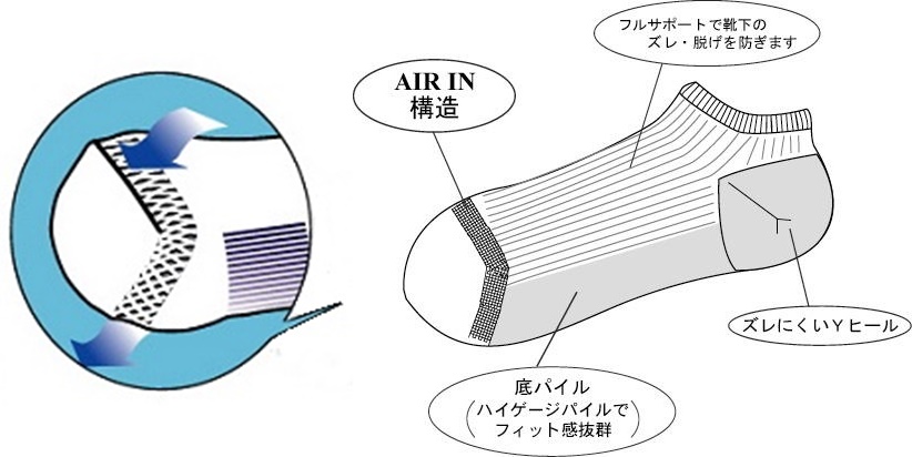 汗をかきやすい指先部分に特殊な織込みを施し通気性を確保したソックスです。